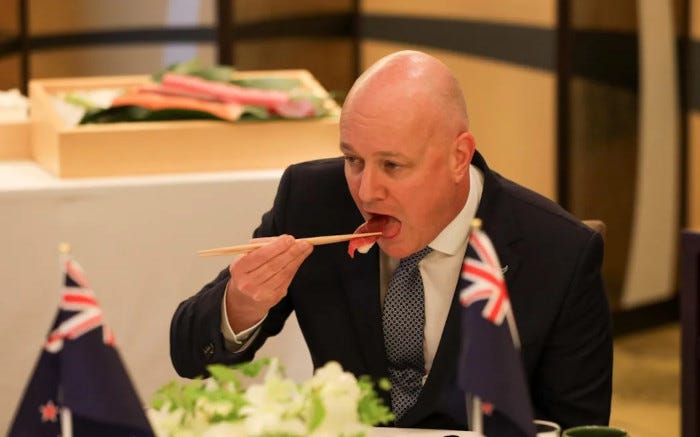 Image of Luxon eating sushi awkwardly is from Radio New Zealand’s “Christopher Luxon gets a ‘C’ on Japan trade trip”. I couldn’t bring myself to show that image of him eating KFC.