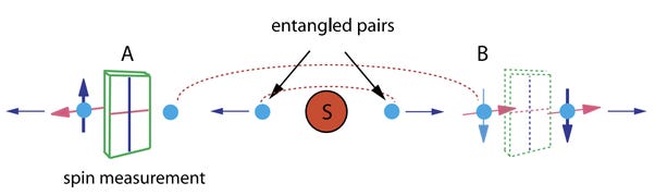 Nineteen thirty-five, to be precise. When (paedophile physicist) Erwin Schrödinger described ‘quantum entanglement’.1 The idea is this: it is quite possible to generate a pair of particles that are perfectly correlated. For example, if we know that a particular property (say ‘spin’) adds up to zero, then when we measure the spin of one particle (say it’s up), we know the spin of the other (it’s down).2
