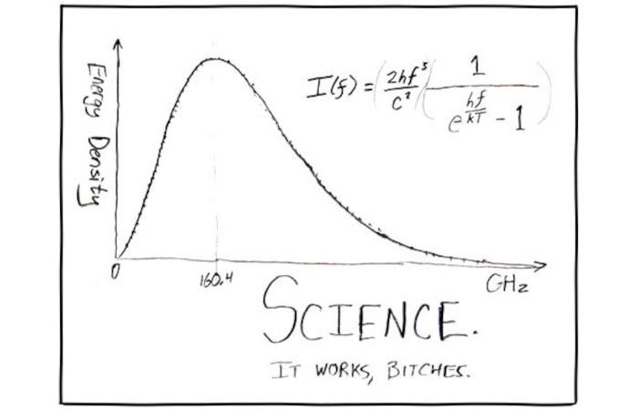 But first, let’s talk about that fabulous XKCD cartoon at the start. I’ve always loved it. The solid curve is the pattern of radiation we expect to be emitted from something very, very cool (2.73 K). That something just happens to be the entire universe, at a point about 0.4 million years after it all started, when it was cool enough to allow photons to escape.