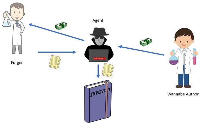 The special issue editor becomes a special friend of the papermill agent (in the above diagram) who sells access to the devious ‘author.’ Genuine research may rub shoulders with and give apparent authenticity to rubbish.