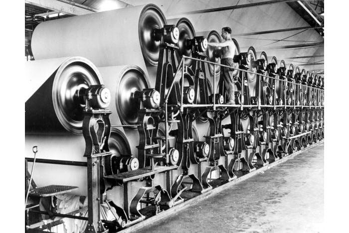 Papermaking filters a dilute suspension of cellulose fibres (wood pulp) through a screen, gets rid of the water, and produces a strong, flat, uniform sheet of paper. Traditionally, papermaking is resource-intensive; a lot of waste is produced. The ‘kraft process’ digests pulpwood to pulp. For every tonne of paper produced, about seven tonnes of black liquor is squeezed out, made up of lignin, soaps, and tall oil, which is in turn made up of rosins (especially abietic acid), fatty acids and other crap. Black liquor used to be dumped, but it is highly alkaline and toxic to wildlife. Almost all of it is now processed in a recovery boiler.