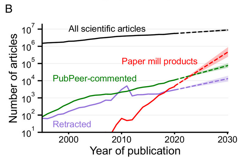 It seems no publisher is immune. Wiley, Elsevier, Taylor & Francis, Springer Nature, PLOS One, Oxford University Press/Karger, the IEEE, the Royal Society of Chemistry and many more are afflicted. The contagion is growing. In 2024, Wiley estimated that 10–13% of submissions to its journals were papermilled. This may not be unusual. Another estimate from the same year suggests 400,000 papermilled articles out there. The graphic at the start of this section is from Fig. 5 of a recent PNAS article, which anticipates papermill products will increase exponentially.3