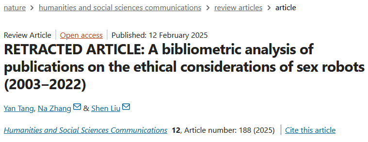 That’s the perfect title, isn’t it? I’m using a little licence here. An article caught my eye, “A bibliometric analysis of publications on the ethical considerations of sex robots (2003‒2022)”, in Humanities and Social Sciences Communications. The journal has an impact factor of 3.7; they claim 3.7 million article downloads in 2021. Springer Nature is often considered a solid publisher. What could possibly go wrong?