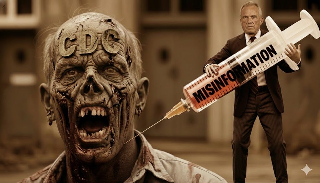 Herodotus relates1 that in ancient Egypt, the bodies of the wives of men of rank were left for a few days before being handed over to the embalmers, to prevent ‘abuse’. Based on what has happened to the ragged corpse of the CDC, I don’t think this delaying tactic would put off modern anti-vax nutjobs for a moment. RFK Jr, renowned for leaving a decaying baby bear in Central Park years ago2 has now had his way with the CDC, reviving it to lurch around zombie-like, biting people with misinformation.