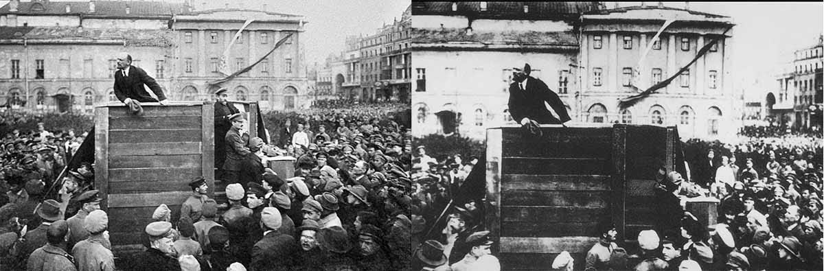 Unfortunately books can also be rewritten, so read carefully. Photos can be photoshopped. Such modification has happened throughout history, even before Photoshop, and especially in countries where autocrats flourished. The classical example is of course the USSR. Take these images of Lenin giving a speech: