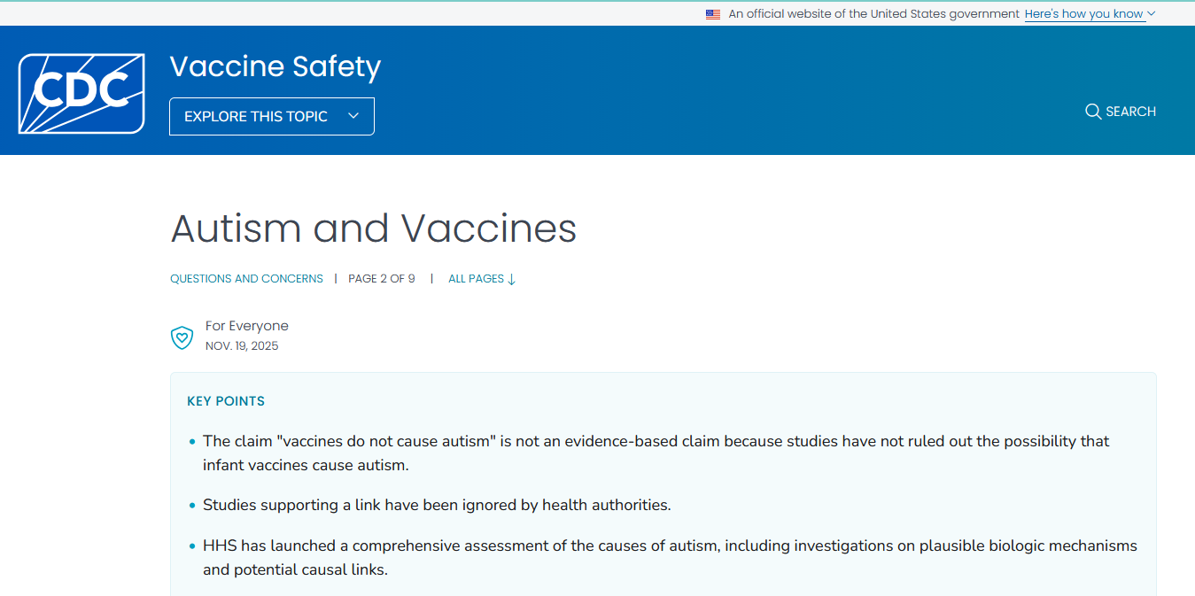A few days ago, the CDC made its ‘Autism and Vaccines’ page anti-vax.3 They resuscitate the zombie claim that “vaccines do not cause autism is not evidence-based”, highlight conspiracy theories about “supportive studies being ignored” and claim they are going to look into “potential causal links”. This is all bullshit.